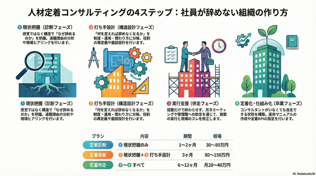 - 内容:ヒアリング/離職構造整理/課題可視化
